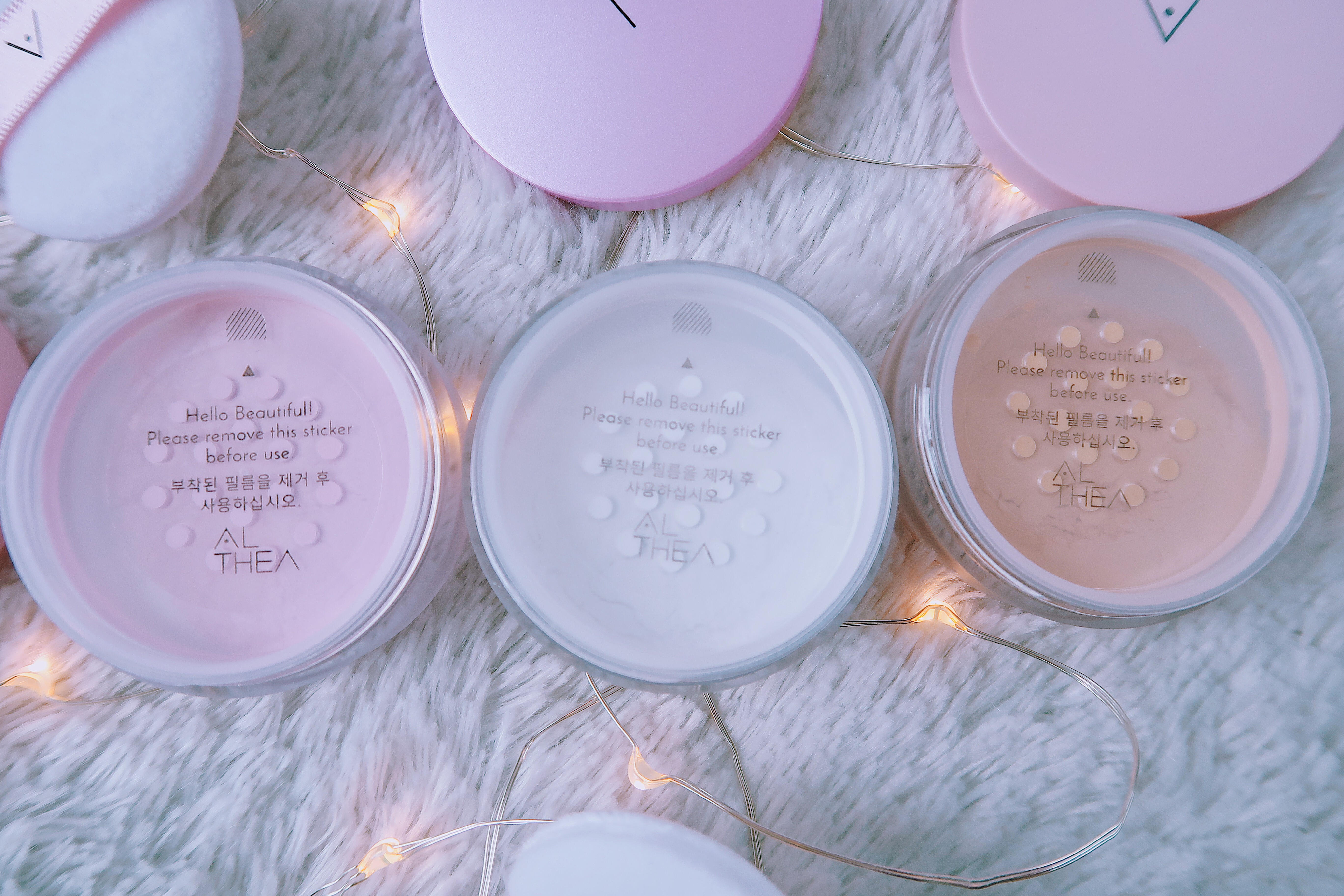 Althea Velvet Powder Petal comes in a small plastic container that is very thick and cute, with a pink lid and an “A” Althea logo. It’s very minimalist and pretty enough. the packaging is smaller than a lot of setting powder, but the price is also lower. This size is perfect for tucking into a small wallet, pocket, and fitting in the palm of my hand. It is equipped with fluffy white pieces that are very soft and puffy with pink satin finger ribbons.